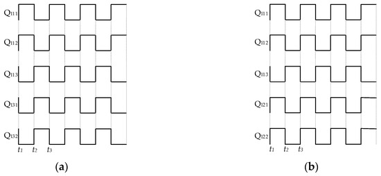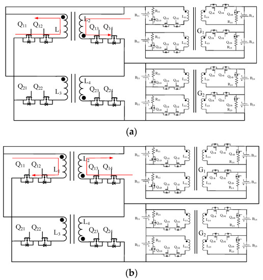 This topology is a double-layer hybrid topology. It adopts an equalization strategy which combines active and passive balancing to improve the balancing efficiency. In addition, because of the double-layer design, it can be used in scenarios where the number of cells is large, and different layers can be balanced at the same time, which significantly reduces the time required for equalization. The bidirectional flyback converter can complete the energy equalization at a higher power level. The active equalization sub-circuit in each group can flexibly realize the energy exchange between cells. Besides, it is supplemented by a passive equalization circuit. The passive equalization method was used as when the voltage difference between battery cells is small, it can accelerate equalization. Specifically, there are four equalization modes (containing three in-group equalization modes and one between-group equalization circuit mode). The corresponding mode description is introduced below.