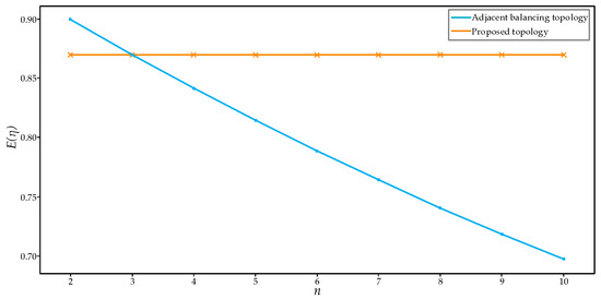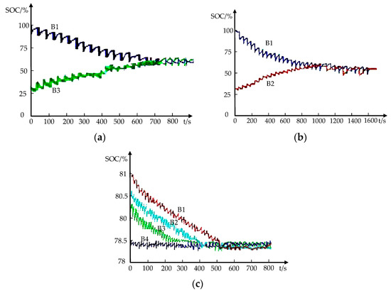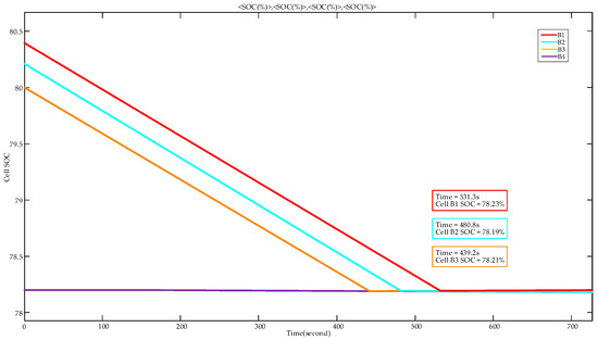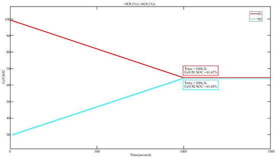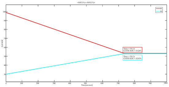 Figure 11, it is clear that the equilibrium time is 731.7 s. By Equation (20), the balancing efficiency of this equalization is about 82.1%. The simulation results show that the topology proposed in this paper can realize the balancing mode of MODE 1, and the balancing efficiency and equalization speed meet the expectation:
