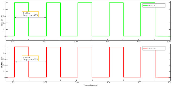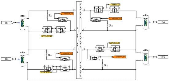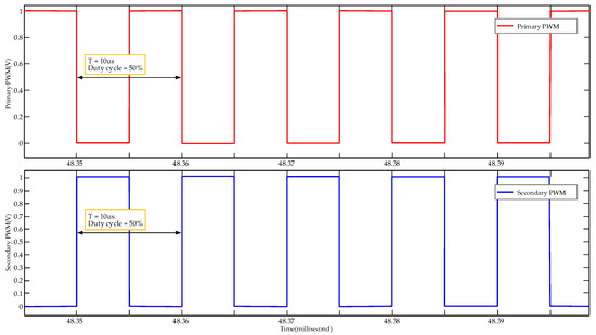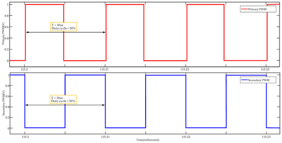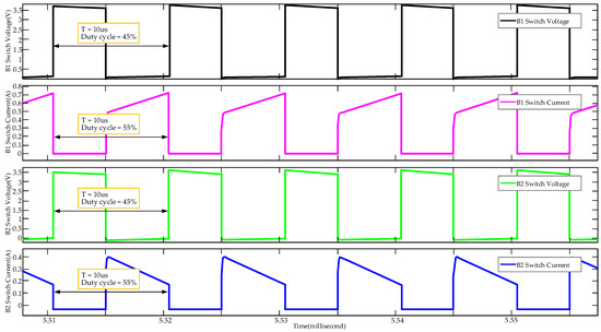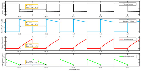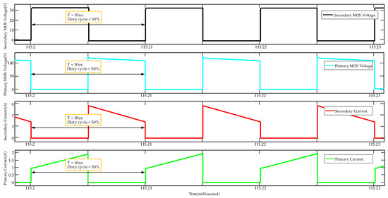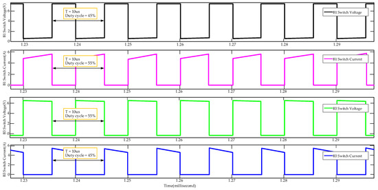 Figure 9. It can be seen that the phase difference between the two was 180°, so the PWM signals were complementary. The circuit worked in the in-group Flyback Mode. The current and voltage waveforms on the bidirectional switch are shown in