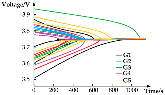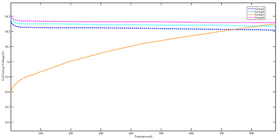 G4 are set to 14.213 V, 14.243 V, 14.251 V and 14.260 V, respectively. The entire process takes 877.8 s. The equalization efficiency can be calculated according to Equation (23).