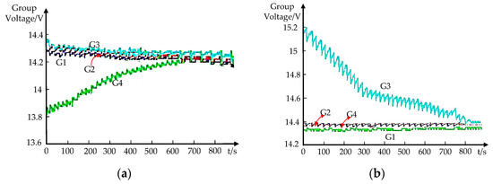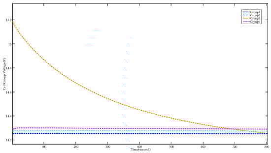 Considering the practical application, the experiment uses the voltage of the battery group as the variable of the between-group balancing. The initial voltages of G1, G2, G3 and G4 are set to 14.345 V, 14.320 V, 13.961 V and 14.292 V, respectively. At this time, the average voltage of the entire power supply system is 14.230 V, and an equalization strategy for charging the battery group G3 by the entire power supply system should be adopted.