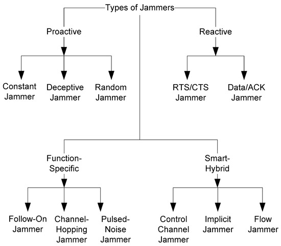 Function-specific jamming—Follow-on, channel-hopping, and pulsed-noise jammers belong to this category. Function-specific jamming methods are implemented using predetermined functions [7,8,9]. They can work as either a reactive or a proactive jammer.