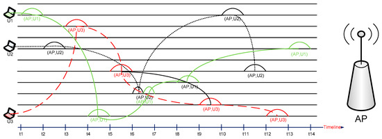 When the jamming attack is detected, we assume that each user node changes its own channel number at the interval of Δ, and this time interval is also referred to as time slot throughout this paper. denotes the channel number selected by node i at time slot t. Then, the first channel number (i.e., ) is the number of the AP’s channel just before the detection of the jamming attack. The subsequent channel numbers are determined by the following equation: