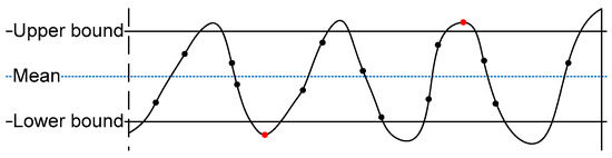 In Figure 4, the values between the upper and lower thresholds are dropped [14,15], and we compare the remaining RSS values with the mean value μ. If the value is larger than the mean value, then we obtain 1. If it is smaller than the mean value, then we obtain 0 according to Equation (1). We determined the upper and lower thresholds after several experiments, and they are set to and , respectively, in this paper, where μ and σ are the average and standard deviation of the RSS values.