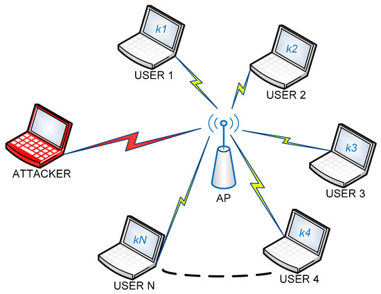 In this section, we assume that there are one AP, multiple (n) user nodes, and one jamming attacker node as shown in Figure 5, and we explain how the jamming attack can be mitigated based on the keys shared between the AP and the user nodes. Let denote the secret key shared between the AP and the i-th user node.