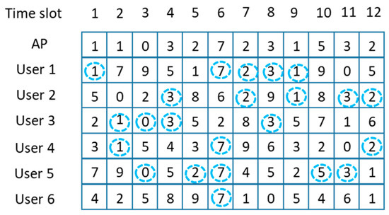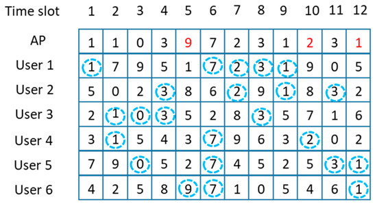 From now on, we discuss the channel selection policy of the AP. Since each user node shares its unique secret key with the AP, the AP can determine the channel number selected by each user node in advance as shown in Figure 6. In this paper, we design the channel selection policy of the AP, considering both the total throughput and the fairness among the user nodes. Figure 6 shows the channel numbers selected by each user node over time, and the channel numbers of each user have been determined by Equation (2). If the AP monitors the channel numbers selected by each user node at time slot 1, then the AP can know the channel numbers selected by each user at time slot 2 since the channel numbers are selected by Equation (2), and the AP knows the secret key of each user. In order to maximize short-term fairness, the AP tries to choose the channel number selected by the largest number of users, which corresponds to the value inside the dotted circle in Figure 6, at each time slot. The AP tries to serve as many users as possible at each time slot. However, if the AP makes a decision on the next channel number only, considering the number of users, there might be a starvation problem. In Figure 6, we can find that the 6-th user node gets significantly less service compared with the other users when the AP considers only the number of users and randomly chooses a channel number when there is a tie in the majority group.