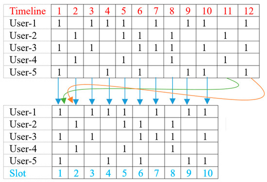 However, the AP cannot store all history information indefinitely due to limited storage space on the AP. In order to solve this problem, we will manage the throughput of each user only for the last L time slots, and this concept is reflected in Equation (3). The throughput for the last L time slots can be managed by storing the throughput for each time slot in an array of size L in a wraparound manner, as shown in Figure 8. As we can see in Figure 8, the AP keeps only the last L values, and if the table is full when new values are obtained, the AP will fill the table from beginning again.