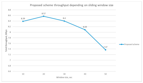 We find an optimal value for L. We run an experiment that compares the total throughput of 10 nodes by increasing the sliding window size L from 10 s to 50 s. In this experiment, we did not consider the jammer. As we can see in Figure 9, 20 s gives a higher throughput compared with the other window sizes.