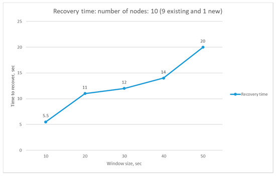 We also want to investigate the effect of the window size L on the starvation of existing nodes, especially in a dynamic case, where some nodes can easily join or leave. Let us consider a case where five nodes have been served by the AP for a long time, and L is 1 day. Then, the accumulated throughput (AT) for the existing five nodes will be a large number if the time slot duration is 1 s. In this case, if a new node joins this subnet, the AP will continuously select the new node in a tie-breaking situation until the AT of the new node reaches that of other existing nodes, and some of the existing nodes might suffer from starvation during this interval. This time interval (i.e., the time duration from the arrival of the new node till the AT of the new node reaches that of the existing nodes) is called the channel recovery time in this paper. We ran an experiment to find an optimal channel recovery time when a new node joins a subnet with nine existing wireless nodes. We measured the channel recovery time (tx) by changing the window size L from 10 s to 50 s, and Figure 10 shows the experiment results. As we can see in Figure 10, the recovery time increases as the window size increases based on the reason explained above. If the channel recovery time increases, then the starvation time can also increase accordingly. By considering the results in Figure 9 and Figure 10, the window size for channel history information window size L is chosen to be 20 s. The scheme with a window size (L) of 20 s gives a higher throughput and a rather small channel recovery time of 11 s.