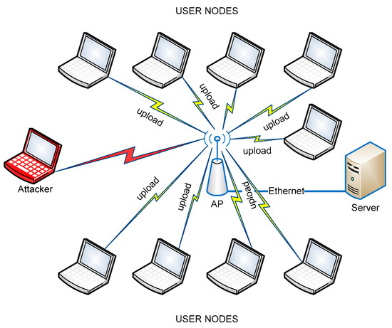 Wi-Fi network with one AP, one attacker, and multiple user nodes.