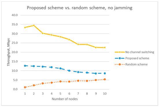 Throughput comparison of the proposed scheme and the random channel-hopping scheme without a jammer.