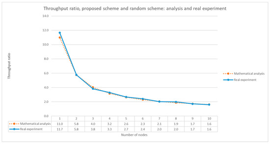We compared the experiment results with the mathematical analysis result. In Figure 13, we can calculate the ratio of the throughput of the proposed scheme to that of the random switching scheme. For example, when the number of nodes is 1, the throughput ratio between the two schemes is 11.7, and when the number of nodes is 10, the throughput ratio is 1.6. Figure 14 compares the throughput ratio obtained by the analysis in Section 5 with the one obtained by the experiment. As we can see in Figure 14, the analysis result agrees well with the experiment results.
