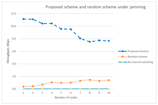 Figure 15 compares the throughput of the proposed scheme with the throughput of the random channel selection scheme when there is a jammer, which behaves according to the attacker model described in Section 4. Figure 15 shows that the proposed scheme yields much higher throughput compared with the random channel selection scheme. The throughput of our proposed scheme is about 5.4 times higher than that of the random channel-hopping scheme when the number of nodes is 10.