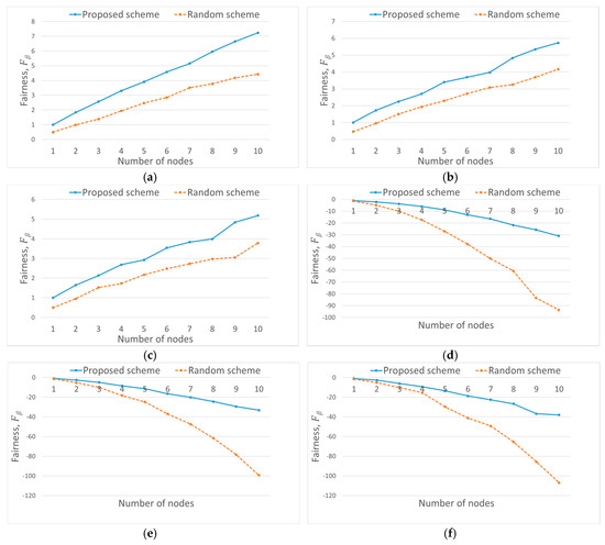 We fixed the duration of the measurement interval to 2 s, and we calculated the fairness index of each scheme for time slot t. We averaged the fairness index over the total simulation time. Figure 16 compares the generalized Jain’s index for the two schemes when there is no jammer. We measured the fairness index for the positive and negative values of β, and Figure 16 shows that our proposed scheme exhibits better fairness than the random switching scheme regardless of the values of β when there is no jammer. Figure 17 compares the two schemes in terms of Jain’s fairness index (J) under the same condition. According to Equation (9), J is different from only by a factor of N, (i.e., the number of users), and we can find an increasing trend in from Figure 16a because of this factor. If from Figure 16a is normalized by N, it agrees well with the graph in Figure 17.