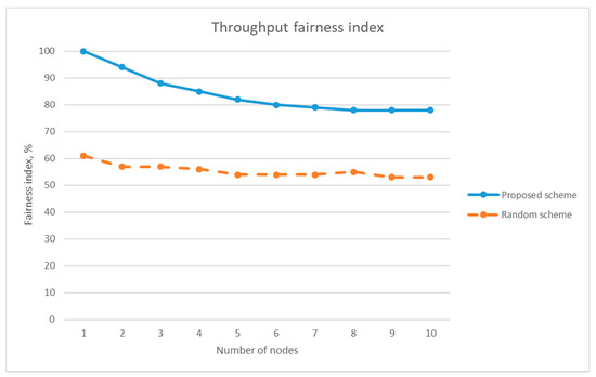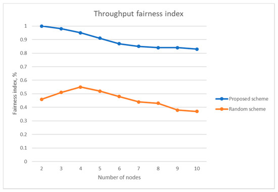 Jain’s fairness index of the proposed scheme and the random channel-hopping scheme without jamming attack.