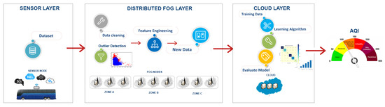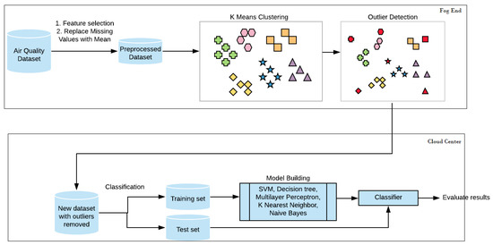 The data that are received by fog layer may contain anomalies that are filtered using data pre-processing and clustering techniques and the clean/relevant data is sent to the cloud layer. This topology/arrangement greatly reduces the data traffic to the cloud, thereby reducing bandwidth and space requirements. The raw data that represent the air pollutants’ concentration are converted to Air Quality Index (AQI) defined by United States Environmental Protection Agency (EPA) [31] and, subsequently, the hourly average of AQI data is computed. In order to filter the data and detect outliers, clustering techniques like K-means is applied on the samples of the dataset. The outliers can be removed at the fog nodes and only selective and useful air quality data are sent to the cloud for further analysis. The filtered data, which are less in volume than before, eventually reach the cloud with a reduced size, thus optimizing the space requirement. The proposed distributed fog nodes may consume more resources, but will eventually speed up the processing and computation.