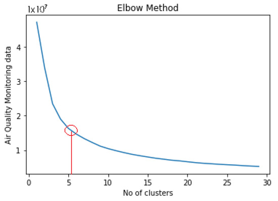 The dataset has a large volume, thus a random selection of 50,000 samples is made due to computational constraints. The AQI features of the four gases i.e., , , , and are selected for further data analysis. The missing samples in the dataset are interpolated with average values. Once the dataset is preprocessed, K-means clustering is used for the incoming data stream processing and outlier detection. The primary reason for choosing K-means [35,36] is its simplicity, and effectiveness for handling the processing of continuous data stream where a high dimensional data is to be sent to the cloud [37,38]. Secondly, K-means is frequently applied to track environmental changes [39].