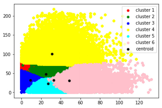 Anomaly Detection [43] is a technique that identifies and filters out the irrelevant data. These irrelevant data points are called outliers and they deviate from the expected behavior. To detect the outliers, we used the K-means clustering technique, where the dataset is divided into K-clusters. We first used the preprocessed data with K in the range of 1:30 in order to decide the number of clusters [44]. The process is then evaluated while using the Elbow method [45], which is the most commonly used method to determine the optimal value of K, at which the cost function stops decreasing (see Figure 5). It can be seen that the optimal score is achieved with the K value equal to 6 (pointed in red in Figure 5), thus dividing the dataset into six clusters, as shown in Figure 6, where the centroids are marked in black dots.