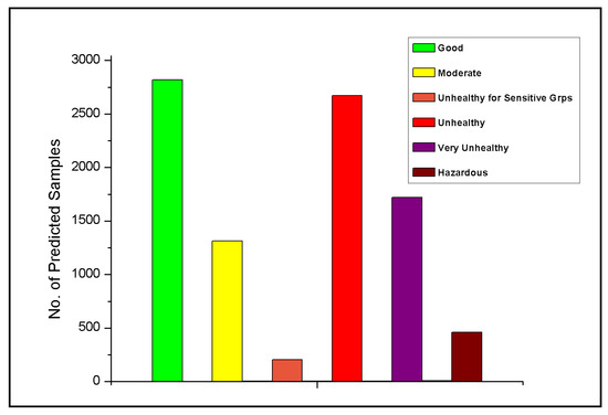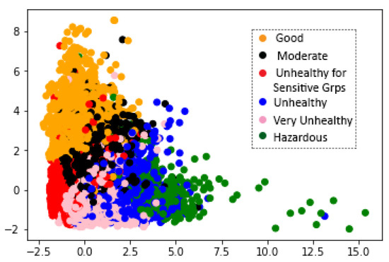 After deciding the number of clusters, the subsequent step is to convert the pollutant gases concentrations to Air Quality Index (AQI) and organized as Good (G), Moderate (M), Unhealthy for sensitive groups (Usg), Unhealthy (U), Very Unhealthy (VU), and Hazardous (H) based on the AQI ranges that are defined in Table 1. Figure 7 shows six clusters of the preprocessed dataset, which can be discerned by the different colors.