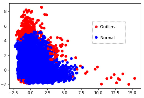 Further, the outliers are detected by identifying the samples that are distant from the centroid. All of the objects in the clusters with a distance greater than the defined threshold, from the centroid of the respective cluster are considered as anomaly [46,47]. With the threshold of 0.01, around six hundred data samples are marked as outliers. The outliers are highlighted in red color in Figure 8 in order to differentiate them from the normal and relevant samples (in blue).