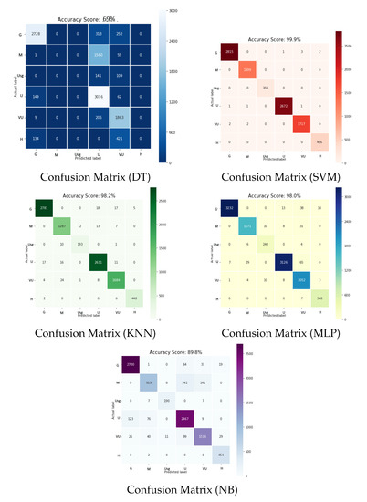 The graph in Figure 9 illustrates the classes predicted by the SVM. Figure 10 shows the confusion matrix for the different classifiers. The Confusion Matrices show the actual and predicted samples for each class. With SVM, we see that 2815 class ’G’ samples are correctly predicted out of 2821 samples. Similarly, 1309/1309 class ’M’ samples are correctly predicted. For class ’U’, two samples are misclassified as class ’G’ and 2 as class ’M’ while 1717 out of 1721 are correctly classified as class ’U’.