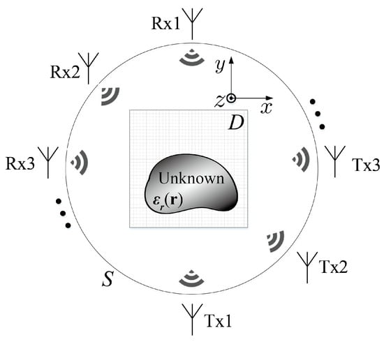 The electromagnetic inverse scattering problems (ISPs) are to reconstruct the geometric shape, constitutive parameters of the unknown scatterers by using the measured scattering data outside the domain of interest (DOI). In recent years, the ISPs have been widely used in target recognition, nondestructive testing, biomedical imaging, microwave remote sensing and so on [1,2,3]. The ISPs are usually cast into optimization problems to minimize the mismatches between the synthetic physical model and the measured field data. For a long time, ill-posedness and nonlinearity have been the two major difficulties faced in ISPs. To alleviate the ill-posedness, different regularization techniques can be employed such as norm total variation in [4,5,6]. On the other hand, according to the model of Lippmann–Schwinger integral equation (LSIE), due to the multiple scattering effects of electromagnetic waves within the DOI, the interaction of the secondary induced current leads to serious nonlinearity in searching the solutions of ISPs, especially when dealing with strong scatterers (the ones with high contrast and/or electrically large dimensions). Researchers in mathematical, physical, and engineering societies have dedicated great efforts in developing more stable and more efficient solvers for decades.