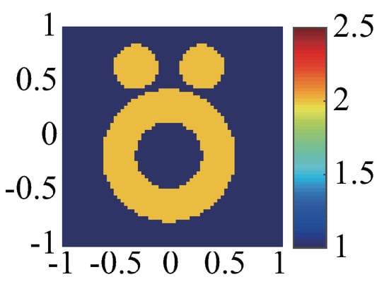 Here, we use the well known “Austria” profile to study the efficiency of the two different wavelets, db20 and bior3.5, to represent the induced currents from the perspective of direct problem (knowing the induced currents). The rectangle domain with the side length of 2 m is selected as the DOI, and its center is located at m. The operating frequencies are 400 MHz and 800 MHz, i.e., the wavelengths of the incident wave are m and m in the background medium air, respectively. As shown in Figure 2, the “Austria” profile (with ) consists of two discs and one ring. The radius of the two discs both are m, and the centers are located at m, and m. The ring has an inner radius m and an exterior radius m, and the center is located at m. There are 16 line sources and 32 line receivers are evenly placed on the circle of radius 3 m. In the forward problem, the scattered fields can be obtained by the full-wave solver with grid meshes and the scattering data matrix size is .