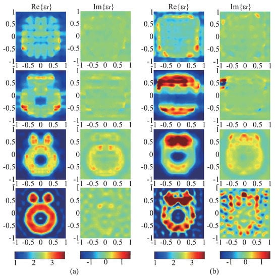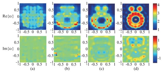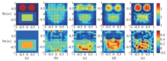 where M denotes the total number of subunits, denotes the relative permittivity of the reconstructed images at the ith subunit, denotes the real relative permittivity of the scatterers at the ith subunit. To further evaluate the reconstruction qualities exactly on the unknown scatterers, another type of relative reconstructed error is defined with the summation of indexes over only the domain where scatterers distribute.