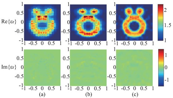 In the fourth example, we choose “Austria” profile with the relative permittivity of 2.0 as the unknown target, but the operating frequency is increased to 800 MHz, with the measurement and inversion setting the same as in the previous examples. At 800 MHz, the electrical size of the DOI becomes , meaning “Austria” profile is a strong scatterer with electrically large dimensions. In the first round of optimization, more wavelet bases should be used represent the induced currents, as mentioned in the previous section. So in this example, we choose the values of being 6, 3, and 0.5 for the three rounds of optimization, coupled with being 256, 512, 768, and is set to 5. The reconstructed results of the three rounds of optimization are shown in Figure 7a–c, in which the first and second rows show the real and imaginary parts of the reconstructed results, respectively. Table 5 shows the errors of the reconstruction results after each round of optimization. It can be seen from the reconstruction results and errors that WT-TSOM can also handle strong scatterers with electrically large dimensions well.