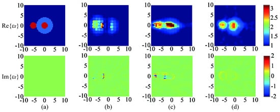 In the last example, the experimental data from Institute Fresnel is utilized to test the proposed method. The used FoamTwinDiel data set is collected with 18 transmitters and 241 receivers at the different frequencies (from 2 GHz to 10 GHz) [27]. As shown in Figure 8a, the FoamTwinDiel consists of three scatterers, i.e., two smaller cylinders with diameter being 3.1 cm and the relative permittivity of 3.0, and a larger cylinder with diameter being 8 cm and . In the inversion, the cm2 DOI with subunits is selected, and the is set to 5. Through numerical testing, it is validated that 9 GHz is the highest frequency which the proposed method can handle. The background air and null as the initial guesses, and the is set to 0.001, 0.0001, and 0.0001 for three rounds of optimization. We choose the values of being 6, 3, and 0.5 for the three rounds of optimization, coupled with being 256, 512, 768, which are the same as those used in the 800 MHz case. The reconstructed results of the three rounds of optimization at 9 GHz by the proposed method are shown in Figure 8b–d, respectively, and the first and second rows show the real and imaginary parts of the reconstructed results, respectively. The errors of reconstructed results are 0.2948, 0.2680, and 0.1591, whereas are 0.2436, 0.1346, and 0.0864, which are obtained after three rounds of optimization with 336, 2678, 1626 iterations, respectively. Again, we see good reconstruction results with the proposed method, esp. the well rectified profile with the coated cylinder on the right hand side, as shown in Figure 8d.