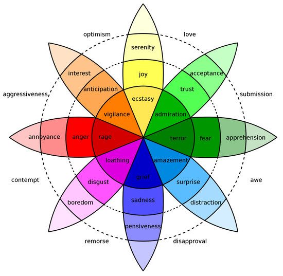 Figure 1. Plutchik’s wheel of emotion. - Dimensional feeling model—The dimensional approach is based on Wundt’s proposal that feelings (which he distinguishes from emotions) can be described as pleasantness–unpleasantness, excitement–inhibition and tension–relaxation, as well as Osgood’s work on the dimensions of affective meaning (arousal, valence and potency). Most recent models concentrate on only two dimensions, valence and arousal. Valence (pleasure/displeasure) depicts how positive or negative an emotion may be. Arousal (activation/deactivation) depicts how excited or apathetic an emotion is.