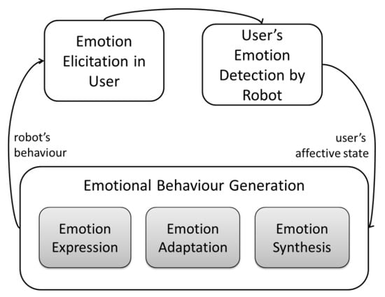 Understanding human emotions by robot and at the same time having the option to express emotion back to human was defined by Höök [33] as affective loop (AL). AL (see Figure 3) is the interactive process in which “the user [of the system] first expresses her emotions through some physical interaction involving her body, for example, through gestures or manipulations; and the system then responds by generating affective expression, using, for example, colours, animations, and haptics” which “in turn affects the user (mind and body) making the user response and step-by-step feel more and more involved with the system” [34].