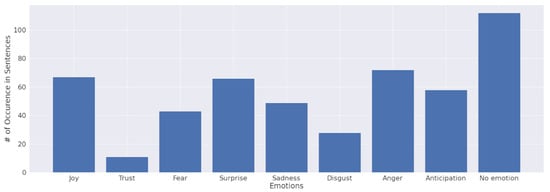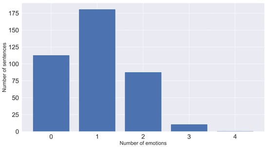 Corpus of English fables consisted of 393 annotated sentences and 2999 unannotated sentences. Further, we will discuss only annotated sentences. Sentences were annotated into eight categories (Plutchik’s eight emotions: joy, trust, sadness, fear, disgust, anger, anticipation, surprise). The number of emotions chosen for each sentence was arbitrary. In Figure 5, the count of each emotion across the dataset is depicted. Figure 6 displays the number of sentences with the number of emotions they contain. As we can see, sentences were mostly rated by one emotion, followed by neutral sentences. Having more than one emotion for a sentence means that we are dealing with a multi-label classification problem. There is no evidence of a positive/negative relationship between emotion’s classes (Figure 7).