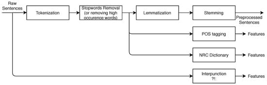The process of data preparation is shown in Figure 8. The first row in the picture represents the process with a sentence. Second-row displays wherein the process features are extracted (e.g., punctuation is gathered from raw sentences; matching emotional words from a dictionary and Part-of-Speech (POS) tagging is done after tokenization and removing high occurrence words). Fables were formatted as follows: one sentence = one row in a document. Firstly we unified every character to lower case; applied function for dividing shortened forms of words into two words (grammatical contractions— ); and cleaned the text from interpunctuation (a sign of question mark, colon and an exclamation mark were used as features). Every sentence was tokenized into words. Afterwards, the POS tagger was applied. Next, we applied the National Research Council (NRC) dictionary to find out if any given word is a word from the vocabulary. In case the word was contained in the vocabulary, we assigned emotion to the word. Finally, we performed stopwords removal and lemmatization of the words (keeping words in their root form).