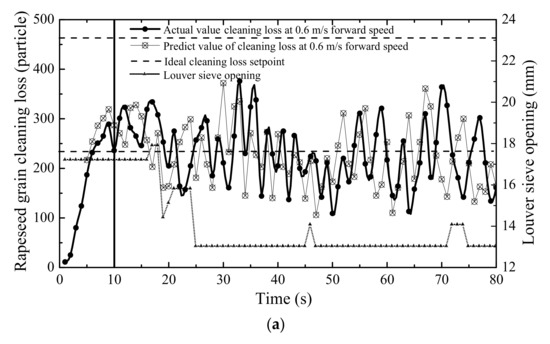 The cleaning loss between 0 s and 80 s was counted. As can be seen from Figure 11a, when the forward speed was 0.6 m/s, cleaning loss stayed in the ideal interval after 25 s. The louver sieve opening was reduced to the minimum value, indicating that the reduction in throughput can decrease cleaning loss, and it was unnecessary to switch on the control device when the forward speed was low.