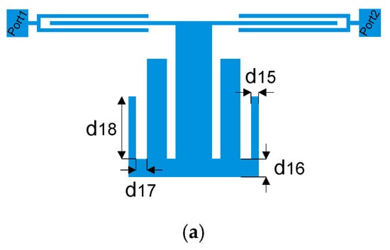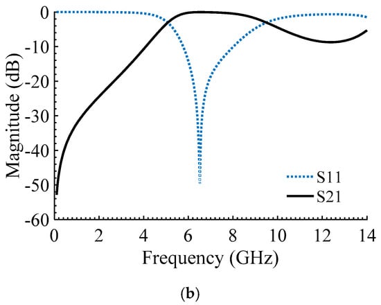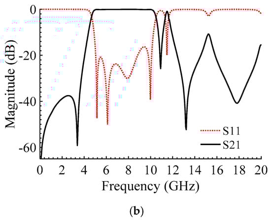 The proposed structure is formed using two small L-shaped stubs added to the bent T-shaped resonator for generating the second passband, as shown in Figure 6a. Figure 6b depicts the second passband fixed at 11.5 GHz.