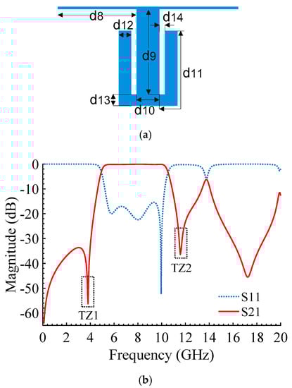 To improve the sub-optimal filtering characteristics of the coupling structure mentioned above, a bent T-shaped resonator is added to the coupling structure, as depicted in Figure 2a. The S-parameters of the single-band BPF is presented in Figure 2b. As observed, the bent T-shaped resonator generates two TZs at 3.8 GHz (TZ1) and 11.6 GHz (TZ2). The passband bandwidth can be tuned by shifting the location of TZ1 and TZ2.