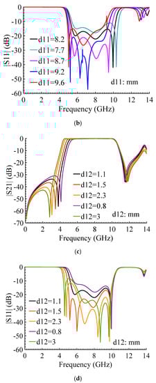 Passband tunability of the single-band BPF (Figure 2a): (a) |S21| variations versus d11, (b) |S11| variations versus d11, (c) |S21| variations versus d12, (d) |S11| variations versus d12.