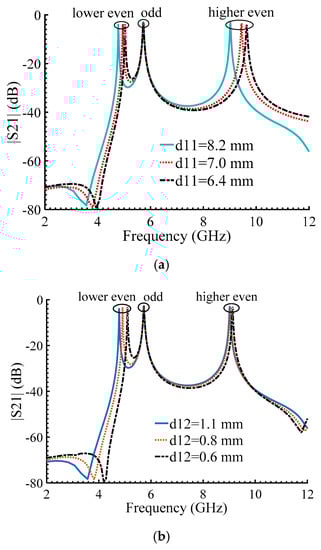 To visualize the modal resonances and verify Equations (6)–(8), the bent T-shaped resonator is simulated under a weak coupling condition. Its S-parameters are plotted in Figure 5, where adjustability of the single-band BPF response is verified through the tunability of the modal resonances. It can be seen from Figure 5a,b that d11 mainly controls the higher even mode (fe2) with a small effect on the lower even mode (fe1), and d12 controls fe1, corresponding to the lower edges of the passband of the single-band BPF, as shown in Figure 4.