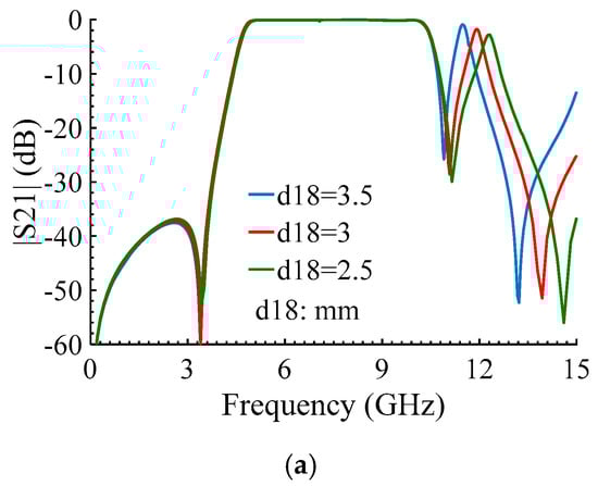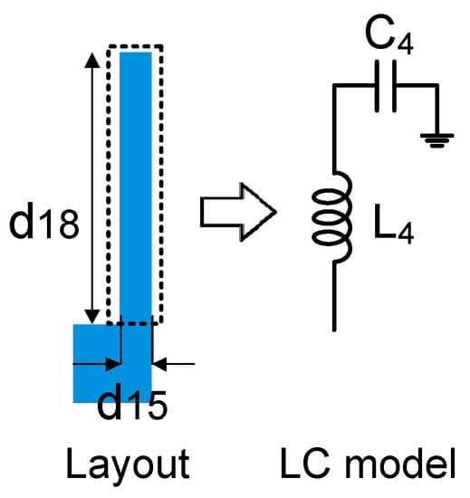 The L-shaped stub and its LC model are presented in Figure 7, where the high impedance open stub is modeled by C4 and L4. The second passband can be tuned within a frequency window of 1270 MHz by varying L4 and C4 corresponding to the physical lengths of d18 and d15, respectively. Variations of the second passband versus d18 and d15 are shown in Figure 8. Another method to reshape the T-shaped resonator’s passband is using a slot in the T-shaped resonator, as explained in [29], where the current distribution of the T-shaped resonator is manipulated by removing a slot from the T-shaped resonator. This method is different from our method, as it can only introduce a narrow stopband within the initial passband. The introduction of the L-shaped stub in the presented approach creates a narrow passband outside the initial passband.