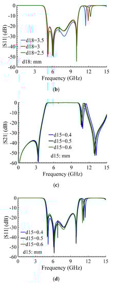 Adjustability of the second passband: (a) |S21| variations versus d18, (b) |S11| variations versus d18, (c) |S21| variations versus d15, (d) |S11| variations versus d15.