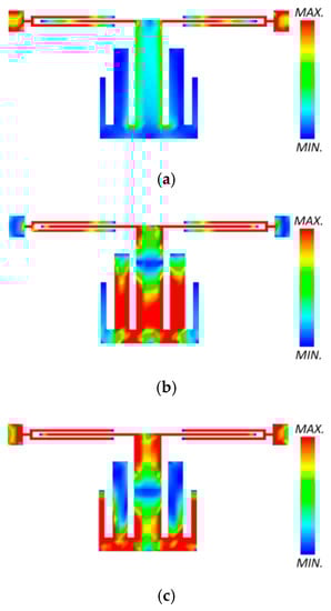Current distributions are employed in this section to further investigate the effects of different filter sections on its frequency response. The current distributions are plotted at three typical frequencies in- and out-of-band response. As shown in Figure 9a, the bent T-shaped resonator and L-shaped stubs do not allow flowing strong currents at 1.76 GHz, representing the filter’s stopband. The current distributions are plotted at 9.68 and 11.5 GHz in Figure 9b,c, representing the filter’s wide and narrow bands, respectively. As seen, the bent T-shaped resonator at 9.68 GHz contributes to generating the wide passband, showing a strong current. The L-shaped stubs contribute most at 11.5 GHz to create the second passband, as shown in Figure 10c.