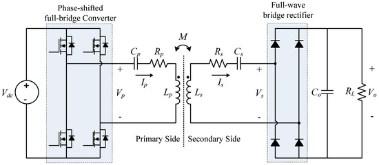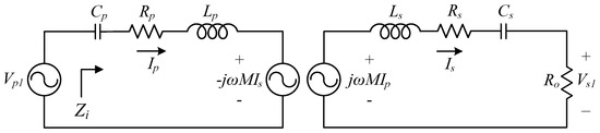 In the WPT structure shown in Figure 1, the resonator stage consists of loosely coupled coils and compensation capacitors. Lp and Ls are the self-inductances, and Rp and Rs are the resistances of the primary and secondary side coils, respectively. The mutual inductance of the coupled coils is denoted as M. In order to improve the power transfer capability, the capacitors Cp and Cs are connected in series to the coils for compensation. The resonance frequency is determined by