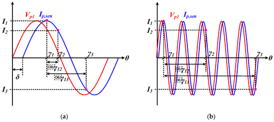 In order to extract three parameters (Io, |Ip|, and δ) that define the primary side current waveform, at least three independent samples are required. Figure 3a shows the example of the super-sampling case that collects three samples in a cycle. Here, I1, I2, and I3 are the amplitudes of the measured current at θ = γ1, θ = γ2, and θ = γ3 respectively. Then, the sampled values of the primary side current are given as
