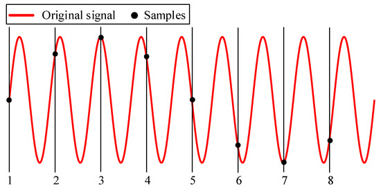Example of the original signal and sampled points where y = 8 and x = 9 (N = 8/9).