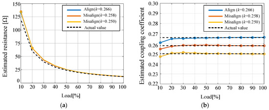 The performance of the estimation procedure is checked before verifying the closed-loop controller. Figure 7 shows the estimated value of (a) RL.est and (b) kest according to the load (10% to 100%, RL = 120 Ω to 12 Ω) and the alignment condition. Here, the actual value is drawn with a dotted line, and the estimated data are drawn with a circular mark connected by a solid line. The blue line represents the case where the coils are correctly aligned (k = 0.266), the orange one represents the case where the coils are misaligned by 4 cm (k = 0.257), and the yellow one represents the case where the coils are misaligned by 4.5 cm (k = 0.250). As shown in Figure 7a, it is noted that RL.est shows almost similar value, regardless of alignment of coils. Moreover, in the case of comparing with real parameters, the estimation error of RL is less than 12% and that of k is less than 2%. The estimation errors in both parameters tend to increase as the load decreases. This is because, as the current signal is decreasing, the estimation process is more susceptible to the current sensing noise, dead time effect, and sampling timing variation due to interrupt latency. The accuracy of the estimation process gets worse at no load or extremely light load condition, since the current level is too low to provide enough information to predict the output voltage. Therefore, the operating range needs to be limited depending on the accuracy of the current measurement and the model parameters.