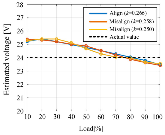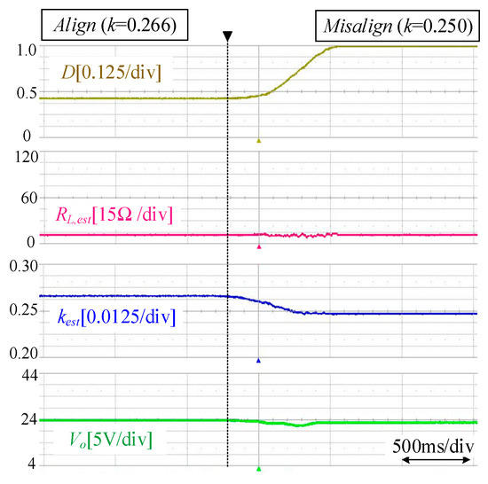 Figure 11 shows the experimental transient response when the alignment of the two coils changes. Here, the value of k is varied from 0.266 to 0.250. The experiment is carried out at 100% load condition. Since the rate of change of k is typically much slower than the rate of change of load, the dynamic behavior of the controller is checked, while the alignment of the coils changes over several hundred milliseconds. As shown in Figure 11, when the coil alignment changes, the controller continuously estimates the change of k and the estimation error is kept within 2%. In addition, as expected, the estimated value of the load resistance is consistently maintained within an allowable range regardless of coil alignment. Based on these estimated parameters, the controller estimates and regulates the output voltage.