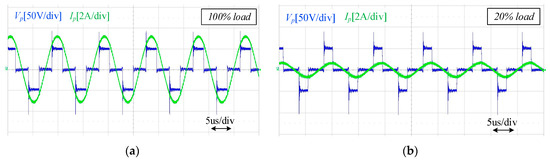 In the control board of the prototype, the digital signal processor (TMS320F28377S) is used. As mentioned in Section 2, the current reconstruction using the digital sampling is inevitably sensitive to sensing noises. Therefore, in the below sub-section, the sub-sampling with the digital band-pass filter is applied to verify the proposed control concept. Here, the controller is designed to get 13 independent samples per 14 cycles (N = 13/14). The switching duty cycle, which is the control variable, is updated every 14 cycles to regulate the output voltage. The sampling and control periods can determined differently depending on the system requirements and the performance of digital signal processors.