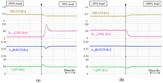 Figure 10 shows the dynamic performance for the step load change where the two coils are aligned (k = 0.266). Figure 10a shows the waveforms of the switching duty cycle (D), the estimated resistance (RL,est), the estimated coupling coefficient (kest), and the output voltage (Vo) when the step load is applied from 100% to 20%. As shown, the output voltage instantaneously increases due to the step load change. The controller immediately recognizes this voltage change and adjusts D. At the steady state, the output voltage is well regulated to the desired value (24 V) within 6% error. It is noticeable that the estimated value of the load resistance and the coupling coefficient are in good agreement with the actual value. Figure 10b shows the same waveforms of the opposite case in which the load is changed from 20% to 100%. In this case, as well, the output voltage is well regulated at the steady state. In both cases, it takes less than 10 ms to reach the steady state.