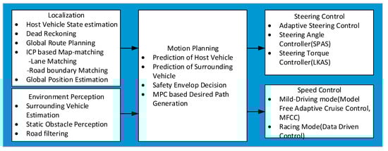 In our autonomous driving system, automotive radar sensor and laser scanner play a key role in localizing and perceiving the environment as described in Figure 2. Radar points wandering on the edges of surrounding vehicles were used to estimate the position and the overall behavior of surrounding vehicles. In addition, LiDAR point clouds whose shapes are similar to the road boundary (i.e., curbstones and guardrails) or vehicles were used for map-based localization or vehicle tracking. LiDAR point clouds also provide information on the static obstacles by overlapping previously measured data clouds.
